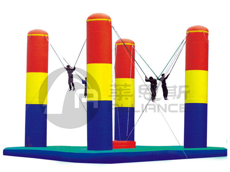四柱充氣蹦極屬于蹦極的一種,在充氣墊上聳立四支充氣柱,相鄰柱子間掛有彈力繩,參與者把身體連接在彈力繩上邊,用力蹦起,借助腳下充氣墊和彈力繩的收縮釋放,身體在空中