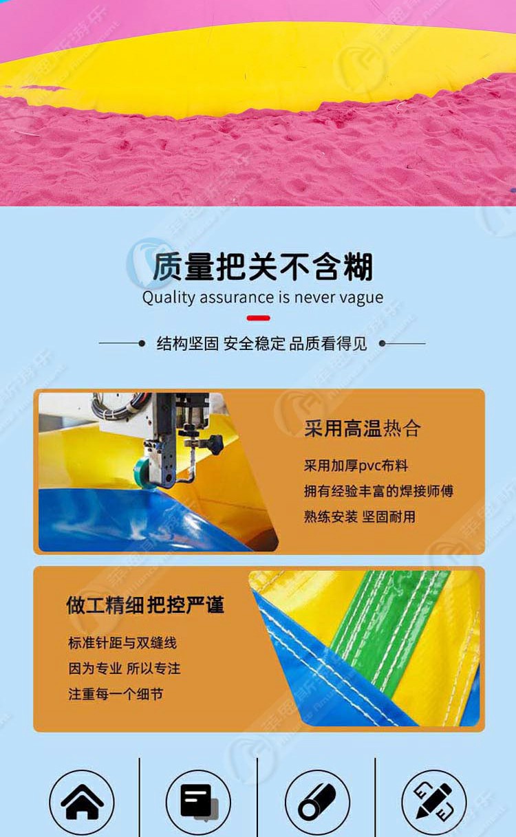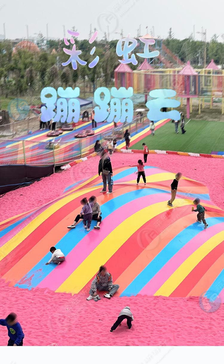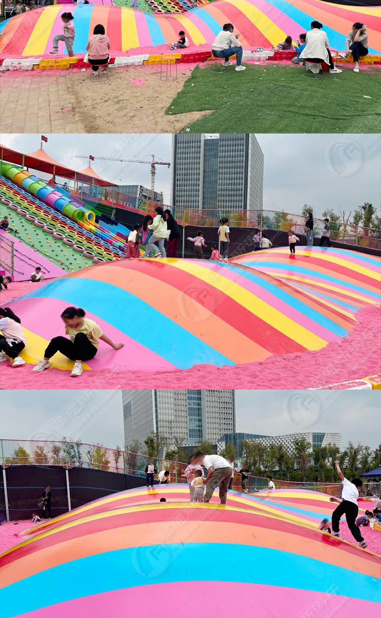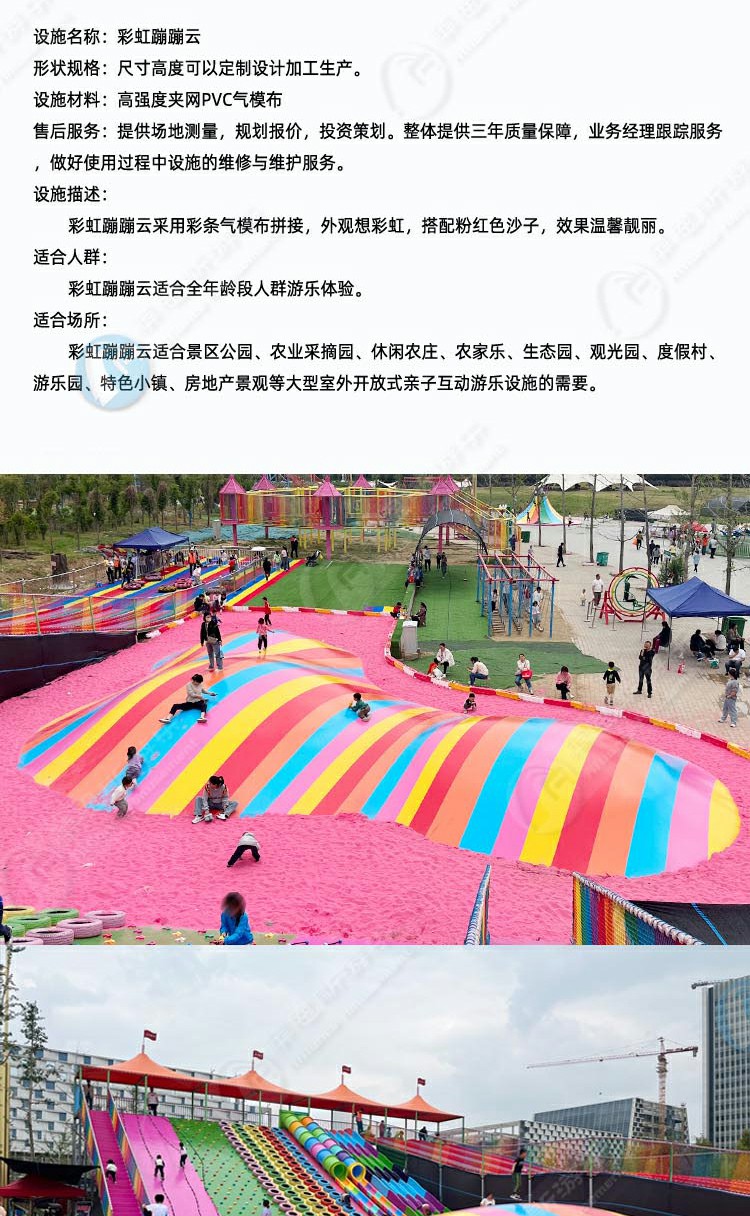 彩虹蹦蹦云采用彩條氣模布拼接,外觀想彩虹,搭配粉紅色沙子,效果溫馨靚麗。彩虹蹦蹦云適合景區(qū)公園、農莊、度假村、房地產景觀等大型室外開放式親子互動的需要。