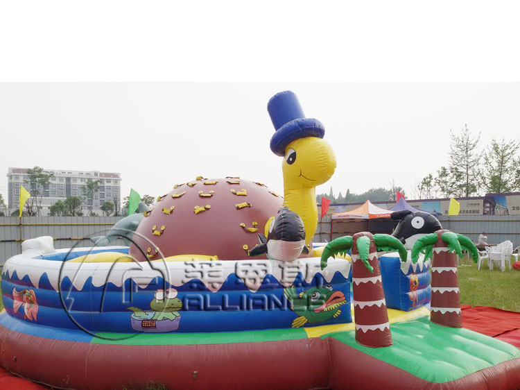 產(chǎn)品介紹 產(chǎn)品名稱:快樂(lè)海龜充氣城堡產(chǎn)品規(guī)格:6x3m(直徑*高)產(chǎn)品材料:0.480.02mm環(huán)保夾網(wǎng)PVC配置:風(fēng)機(jī)、布料、膠水 供氣方式:風(fēng)機(jī)連續(xù)供氣使用壽命:12-14萬(wàn)人次保修期:充氣城