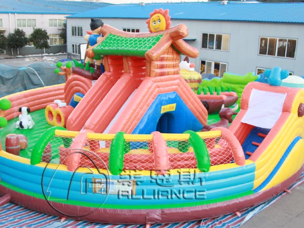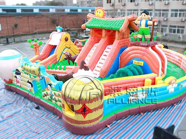 產(chǎn)品名稱:開心農(nóng)場充氣滑梯樂園產(chǎn)品規(guī)格:15x14m(長*寬)產(chǎn)品材料:0.48±0.02mm環(huán)保夾網(wǎng)PVC配置:風機、布料、膠水供氣方式:風機連續(xù)供氣使用壽命:12-14萬人次 保修期:產(chǎn)品出售后三年內(nèi)免費提供布料,膠水。業(yè)務(wù)經(jīng)理跟蹤服務(wù),幫助客戶解決經(jīng)營中出現(xiàn)的疑難問題。產(chǎn)品描述: 本款充氣滑梯采用人們耳熟能詳?shù)墓旁?憫農(nóng)為元素設(shè)計而成.整體布局緊湊,有別于市場上現(xiàn)有的同類產(chǎn)品,獨樹一幟。玩法多樣,循環(huán)往復(fù),既是嬉戲的迷宮,又兼具充氣滑梯的功能,房子造型惟妙惟肖,卡通造型既童話又真實,整體一氣呵成,一副鋤禾辛苦勞作的意境。既讓寶寶體會到農(nóng)民辛苦勞作的不易,又懂得節(jié)約糧食,寓教于樂。讓小朋友可以攀爬鍛煉身體,在其中蹦、鉆、攀、滑等各種活動,充分鍛煉小朋友的能動力。適用場地: 可用于城市廣場、公共休閑空地、公園、操場、景區(qū)、度假村、幼兒園學(xué)校等場地。溫馨提醒: 在購買充氣滑梯時,您不但要考慮產(chǎn)品的價格,而且還要考慮質(zhì)量,優(yōu)質(zhì)的材質(zhì)能提高產(chǎn)品安全保障和使用壽命!