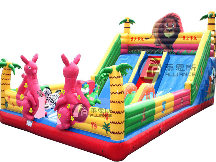產(chǎn)品名稱:獅子充氣滑梯產(chǎn)品規(guī)格:10*6*5.3/11*7*5.3/12*6*5.3m(長*寬*高)產(chǎn)品材料:0.48±0.02mm環(huán)保夾網(wǎng)PVC配置:風(fēng)機(jī)、布料、膠水 供氣方式:風(fēng)機(jī)連續(xù)供氣使用壽命:12-14萬人次保修期:產(chǎn)品整體提供三年質(zhì)量保障,三年內(nèi)免費(fèi)提供布料,膠水。業(yè)務(wù)經(jīng)理跟蹤服務(wù),幫助客戶解決經(jīng)營中出現(xiàn)的疑難問題。產(chǎn)品描述: 獅子充氣滑梯城堡再現(xiàn)經(jīng)典影視獅子王,兩只袋鼠站立門口兩側(cè),守衛(wèi)者森林,獅子王站立大滑梯頂,注視著遠(yuǎn)方,守衛(wèi)著自己的領(lǐng)土。各種小動(dòng)物栩栩如生,整體造型新穎,深受小朋友喜愛。適合人群: 適合3-12歲兒童。適用場地: 可用于城市廣場、公共休閑空地、公園、操場、景區(qū)、度假村、幼兒園學(xué)校等場地。溫馨提醒: 在購買產(chǎn)品時(shí),您不但要考慮產(chǎn)品的價(jià)格,而且還要考慮產(chǎn)品的質(zhì)量,優(yōu)質(zhì)的材質(zhì)和工藝能提高產(chǎn)品安全保障和使用壽命!